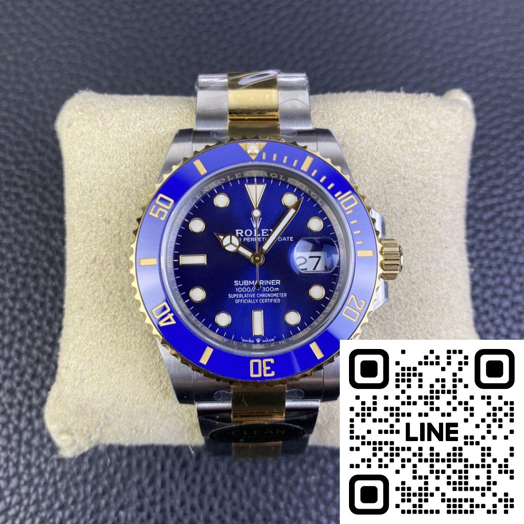 通称「ブルーサブ」。鮮やかなブルー文字盤とゴールドコンビの高級感は抜群。Clean工場はブルーの色味や放射仕上げ、Cerachromベゼルの質感まで高精度に再現。Cal.3235クローン搭載で実用性も高い。