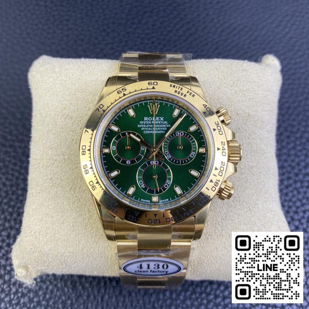 近年、圧倒的な注目を浴びている「緑金ディトナ」。クリーン工場が2年の開発を経て完成させたこの文字盤は、市場唯一といえる完成度を誇ります。Cal.4130クローンムーブメント搭載で、ブラックエナメルのベゼル刻印まで忠実に再現。まさに特別な一本。