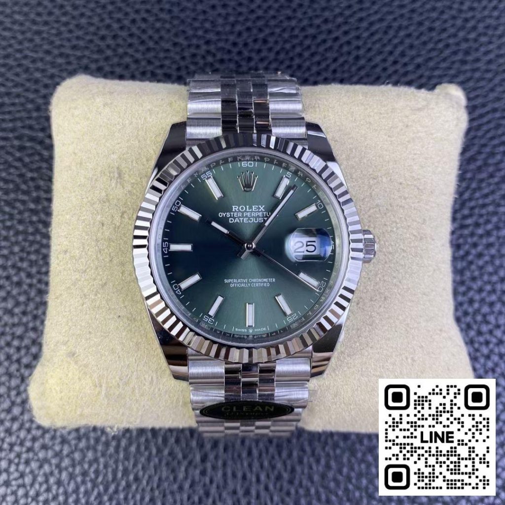 クリーン工場の代表作のひとつがこのグリーンダイヤルのデイトジャスト。太陽光で美しく輝くサンレイダイヤルは本物と見分けがつかないほど。Cal.3235クローンムーブメントを搭載し、日付表示や針夜光も完全再現。さらに、日付フォントのディテールや針・インデックスの夜光も原装と同等。クリーンファクトリーらしい徹底したこだわりを感じさせます。