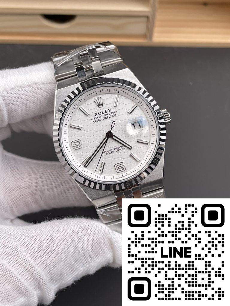 ユニークな蜂の巣模様が印象的なランドゥエラー。ホワイトダイヤルは清潔感とラグジュアリー感を兼ね備え、ES工場がケース厚やラグの形状まで忠実に再現。薄型ムーブメントにより、着け心地も抜群です。