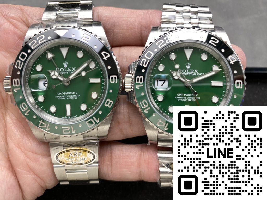 2025年新作GMTマスターIIグリーンは、鮮やかなグリーン文字盤とベゼルが特徴。ARFはCal.3285クローンムーブメントを採用し、24時間針独立可動や両方向回転ベゼルを忠実に再現。夜光インデックスも本物同様の輝きを放ちます。