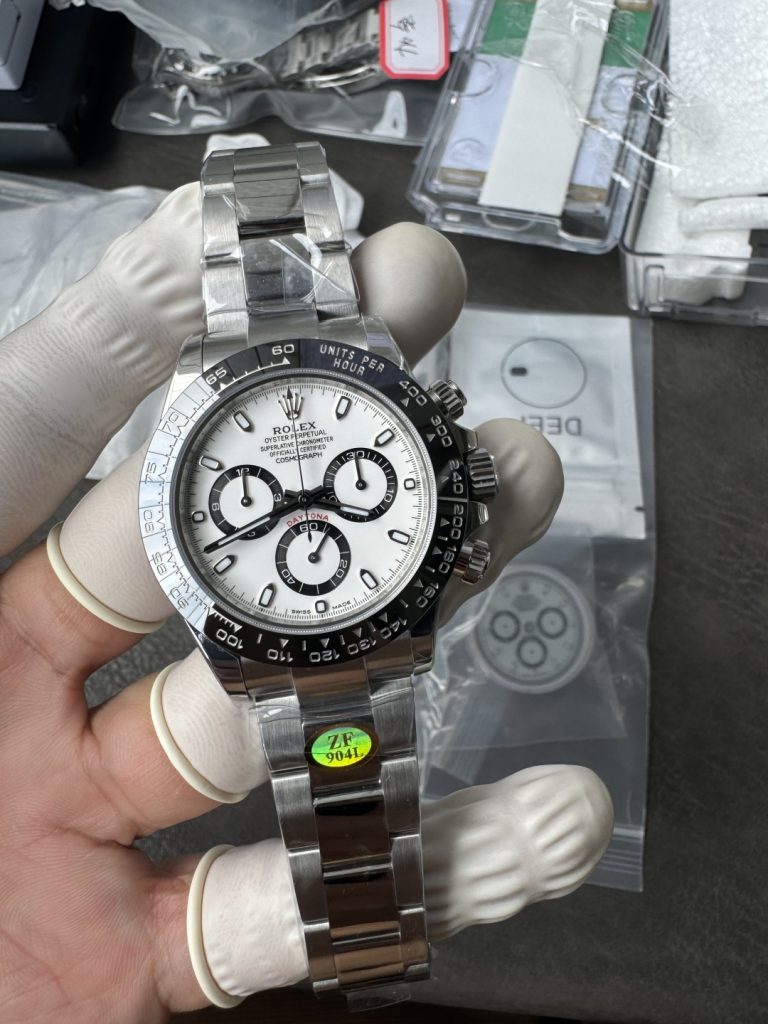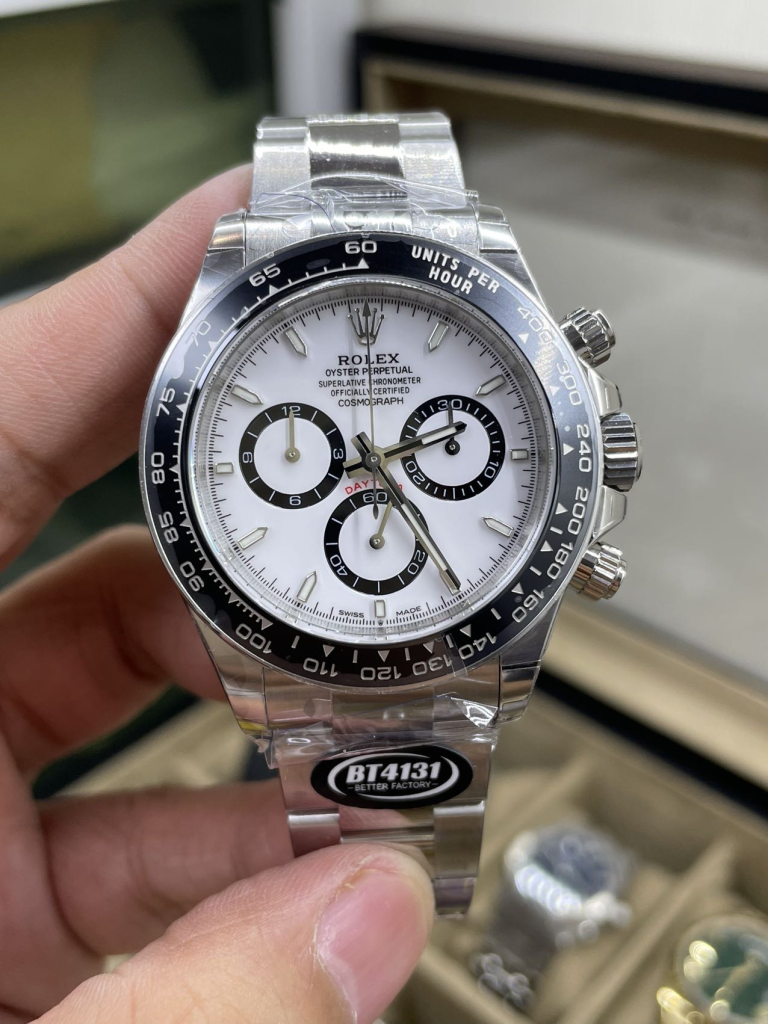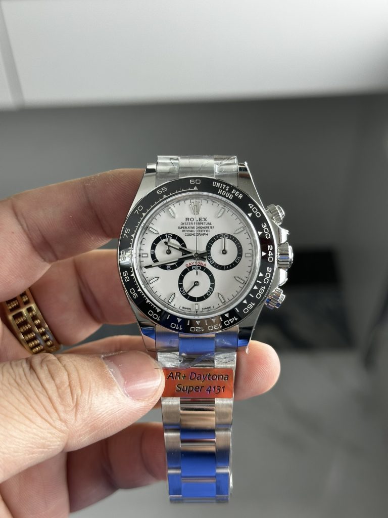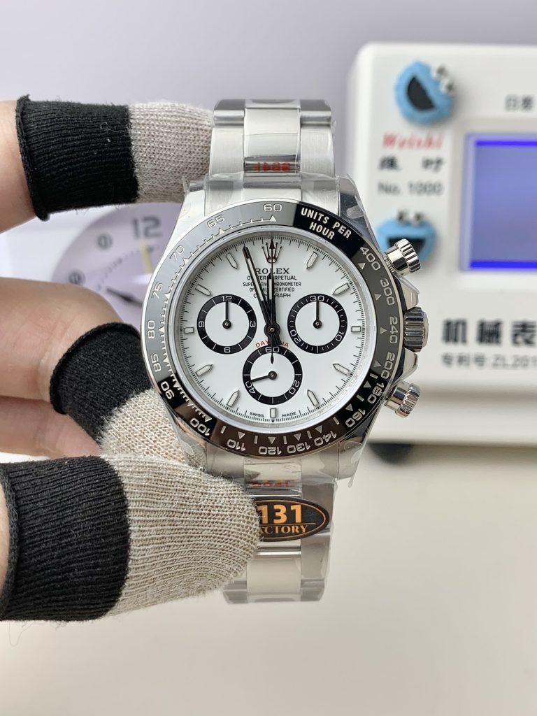 VS工場の最新型パンダダイヤル デイトナは、完全新開発の丹东4131ムーブメントを搭載し、ケース径40mm、厚さは正規品同様の11.9mm。全機能がオリジナル仕様通りに動作し、2段階の時刻調整やクロノグラフ機能も完全再現。 7750ベース改造モデルの14.5mm厚に比べ、大幅な薄型化を実現し、着用感も格段に向上しています。