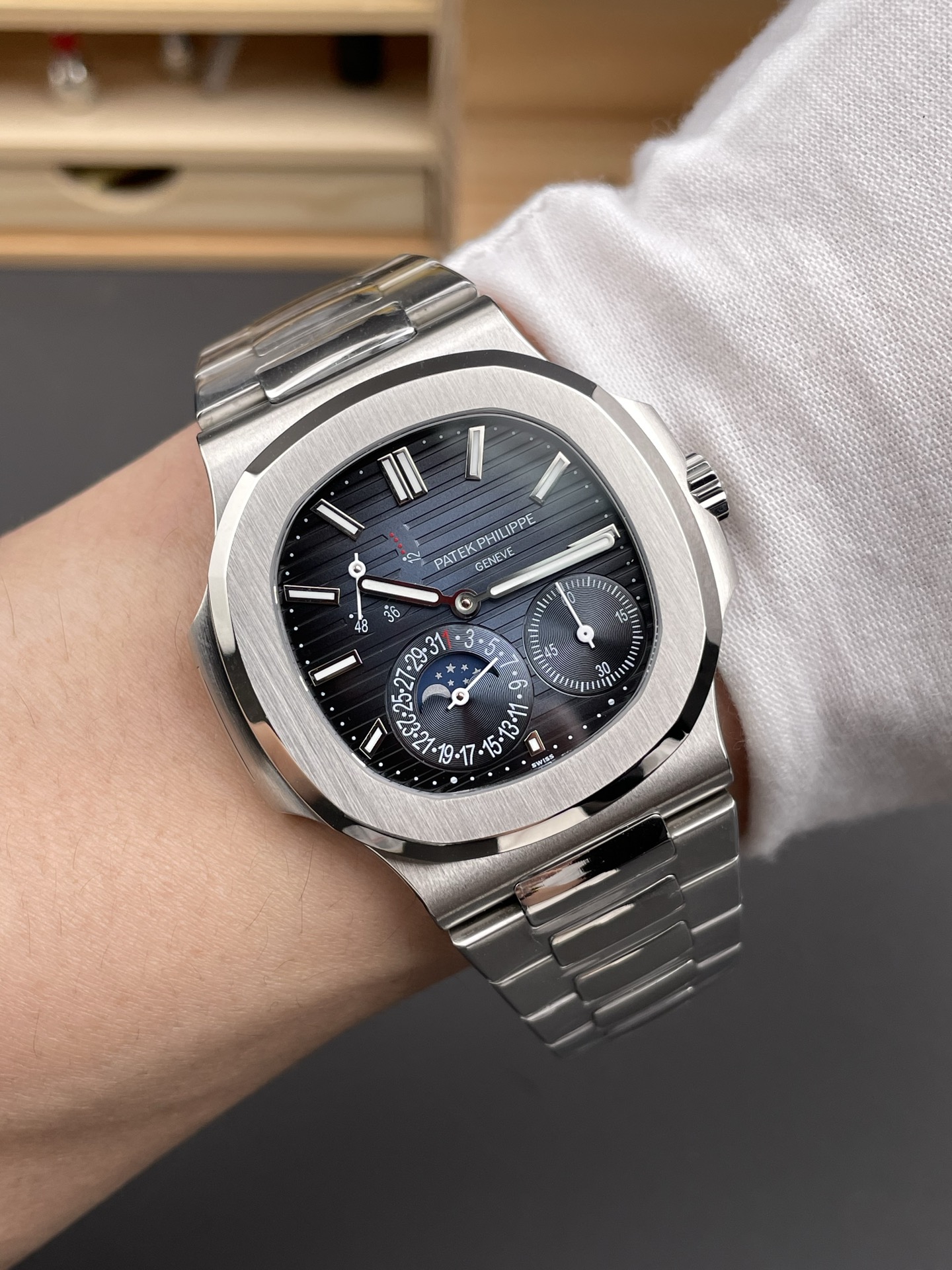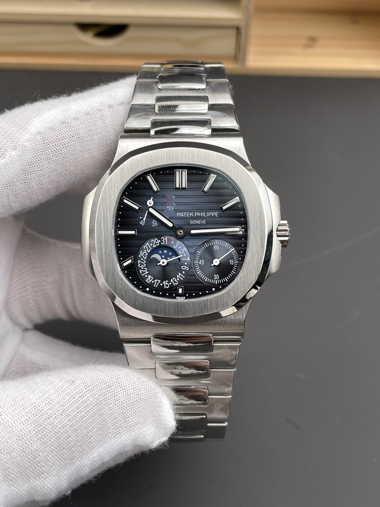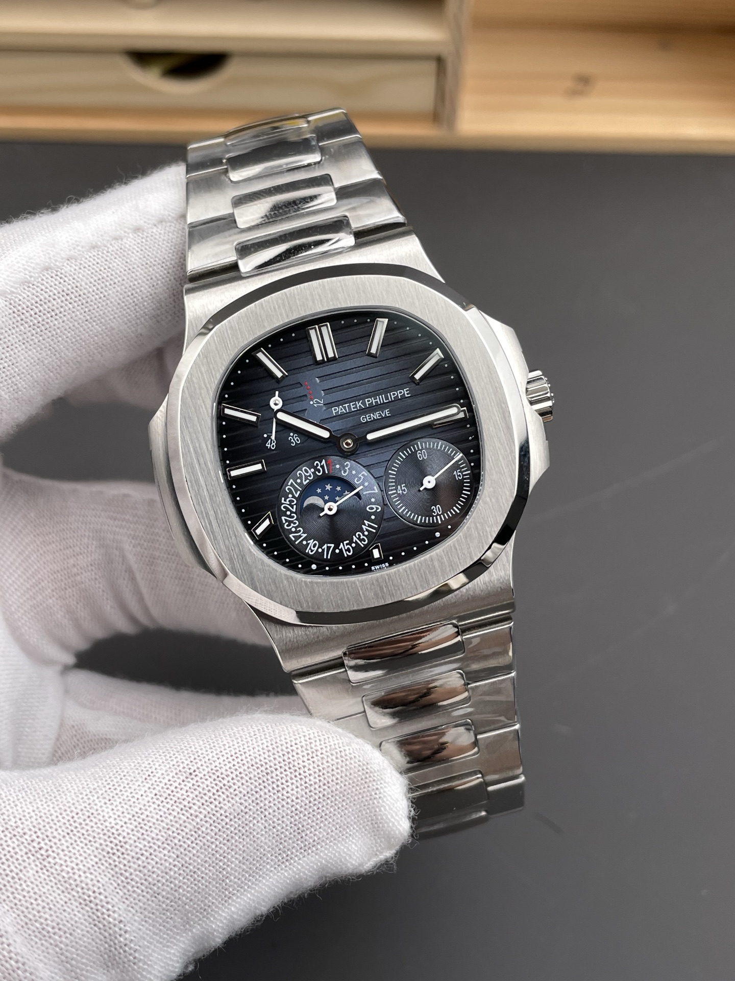 GRファクトリーの新作 “5712/1A” は、百达翡丽ノーチラスシリーズの中でも非常に特別なモデルです。 Cal.240 PS IRM C LU を搭載した「スーパー一体型ムーブメント」を使用し、その精緻な作りは本物を超える完成度を誇ります。さらに、精巧に設計された ブルーグラデーション文字盤(“ブルー鬼魅”) と、金属感が見事に表現された 高精度ステンレススチール ブレスレットが特徴的です。多機能なダイヤルに加えて、シンプルなデザインが洗練された美しさを引き立てます。