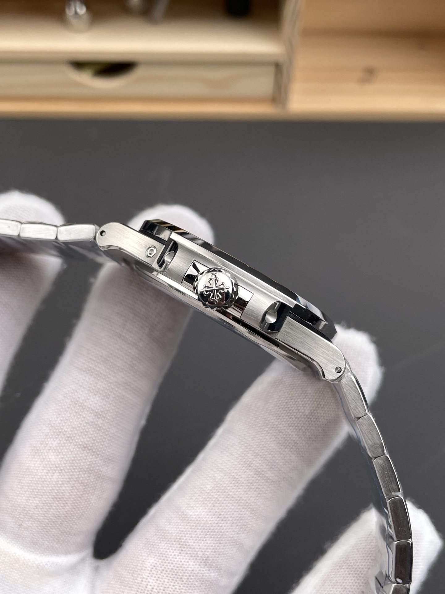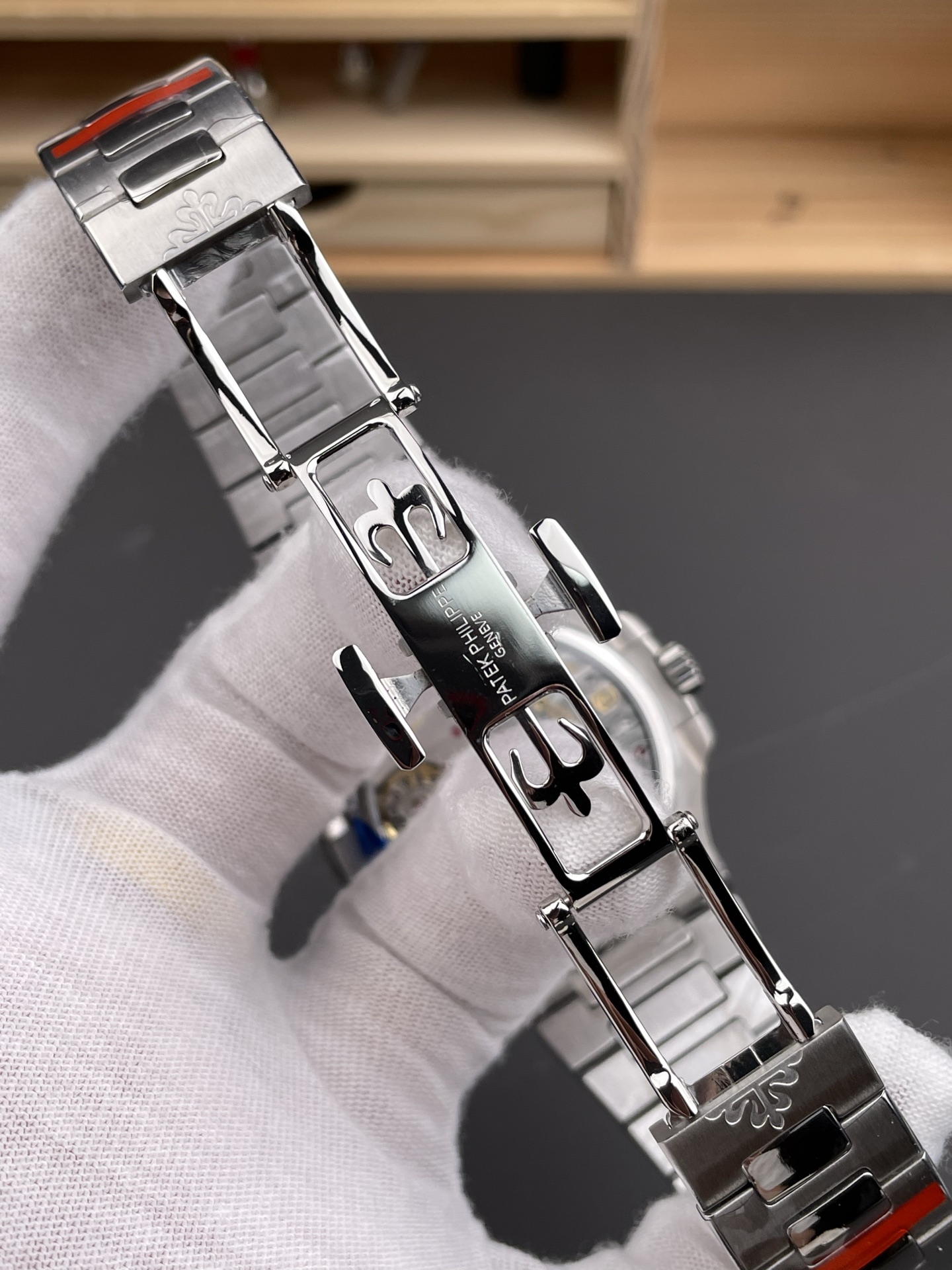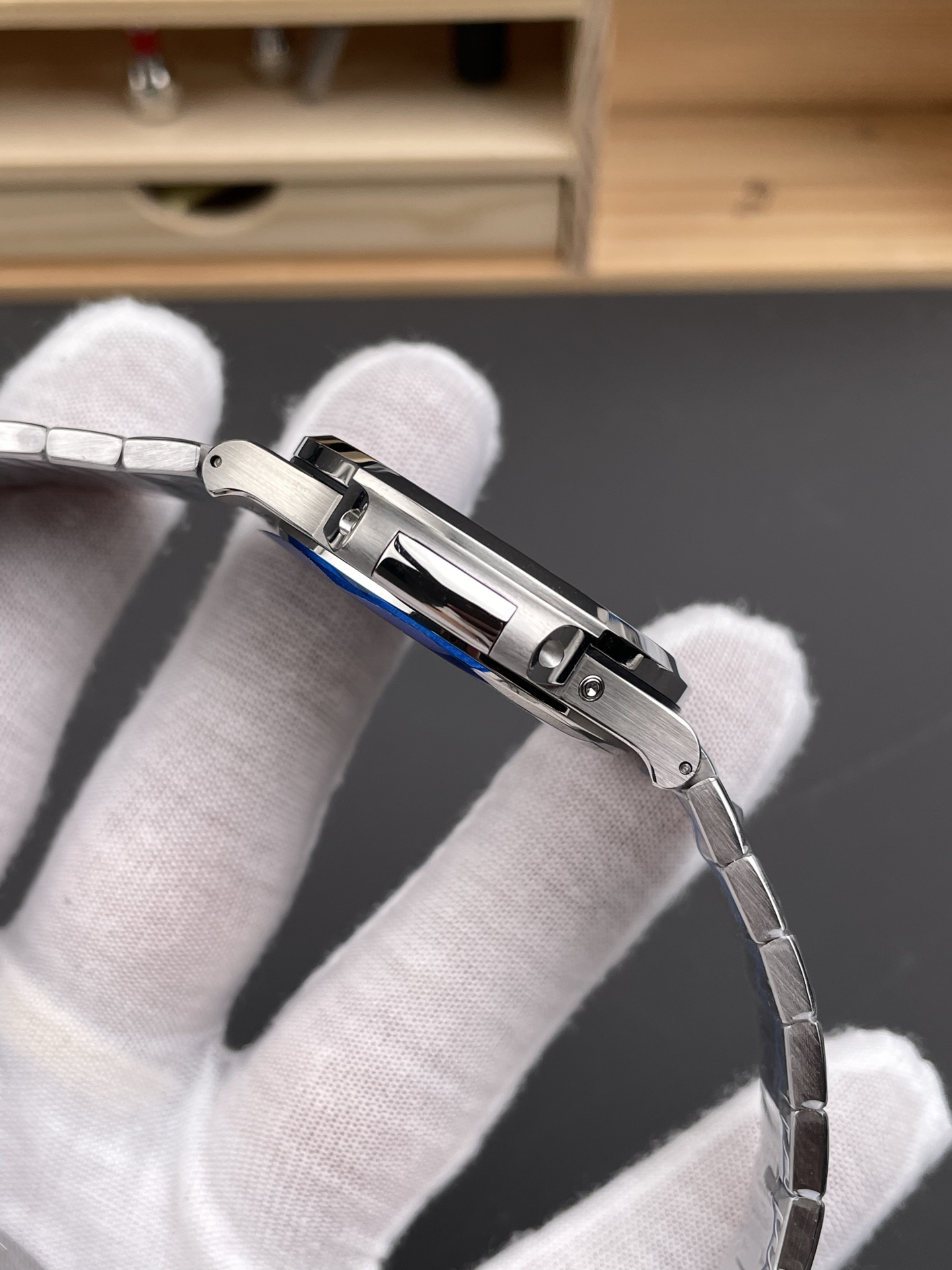 GRファクトリーの新作 “5712/1A” は、百达翡丽ノーチラスシリーズの中でも非常に特別なモデルです。 Cal.240 PS IRM C LU を搭載した「スーパー一体型ムーブメント」を使用し、その精緻な作りは本物を超える完成度を誇ります。さらに、精巧に設計された ブルーグラデーション文字盤(“ブルー鬼魅”) と、金属感が見事に表現された 高精度ステンレススチール ブレスレットが特徴的です。多機能なダイヤルに加えて、シンプルなデザインが洗練された美しさを引き立てます。
