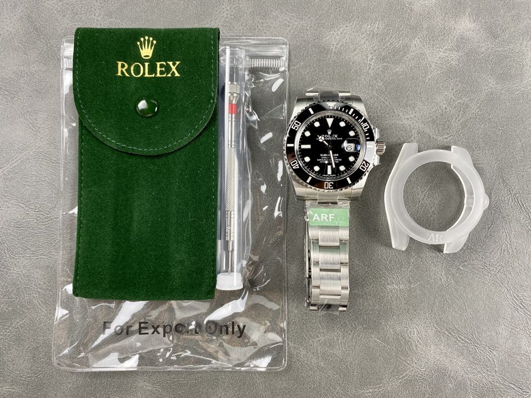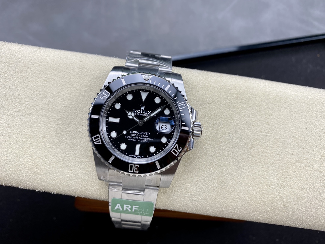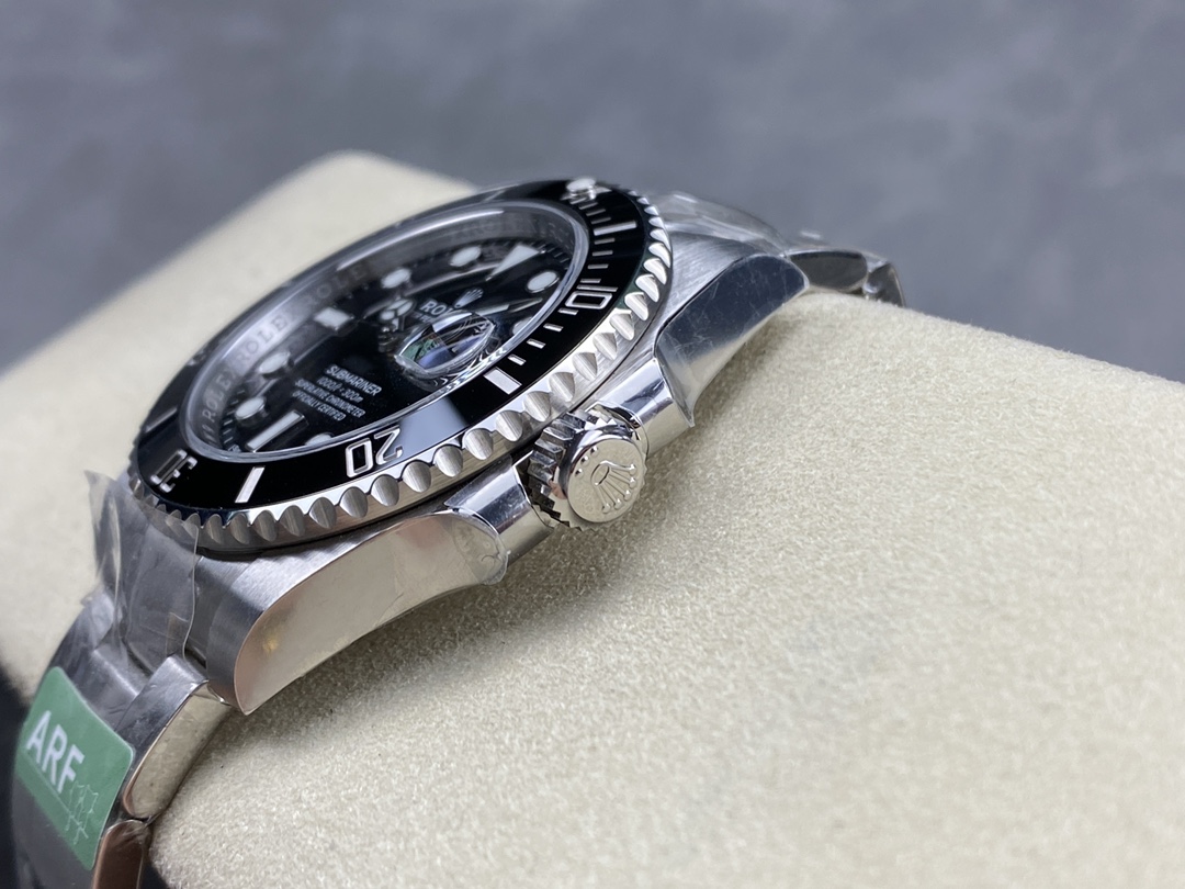 ARファクトリーは外装仕上げとブレス一体感で知られる工房。黒セラミックのシルバーブライト刻印、端リンクの段差抑制、クラスプのクリック感まで詰めたスーパークローン仕様。