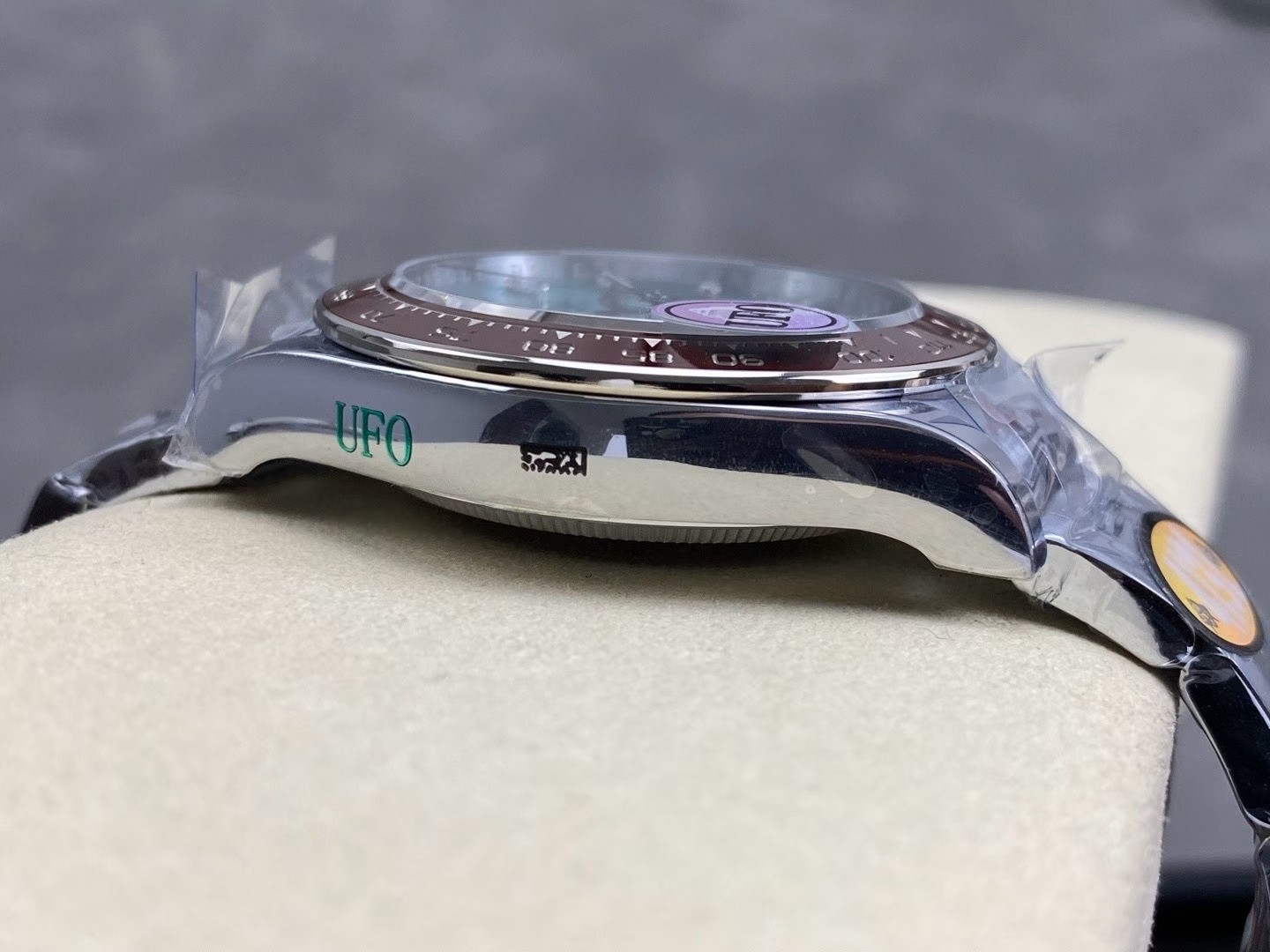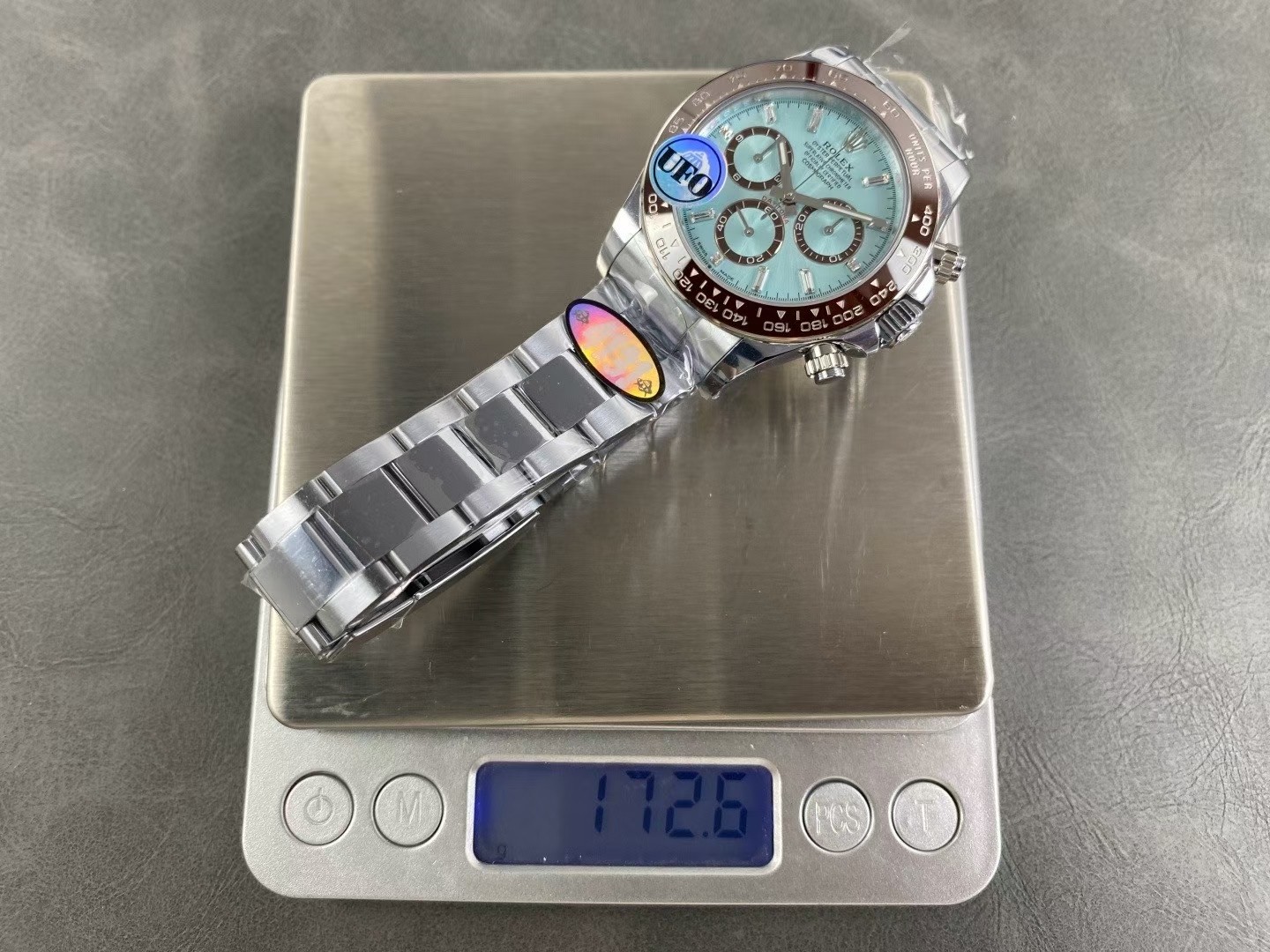 UFOファクトリーが搭載する4131フリースプラング一体構造ムーブメントは、安定性と精度を重視した最新仕様。大胆なシースルーバックを採用し、ムーブメントの美しさを隠さず魅せる設計が特徴です。アイスブルー文字盤と バゲットダイヤインデックス(モアサナイト)の組み合わせが上品に輝き、QF製ケースの精密な仕上げが全体の高級感を一段と引き上げています。173gの正規級に近い重量感も魅力です。