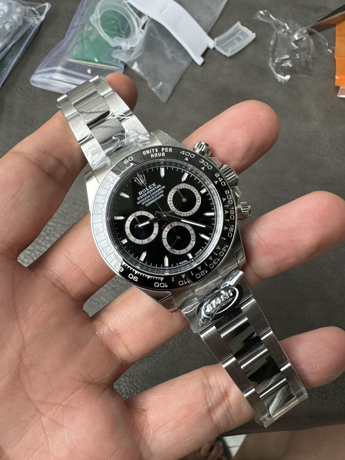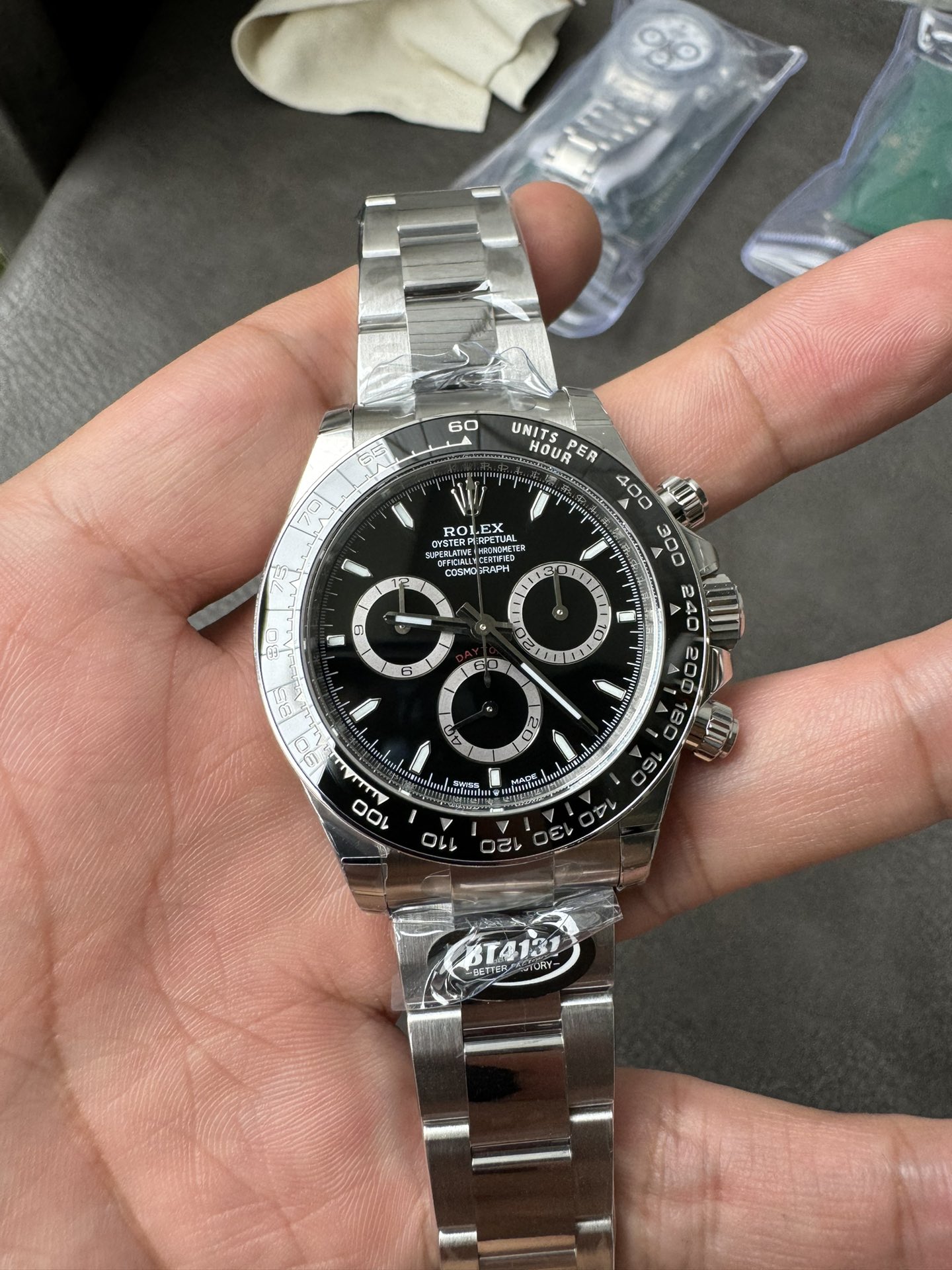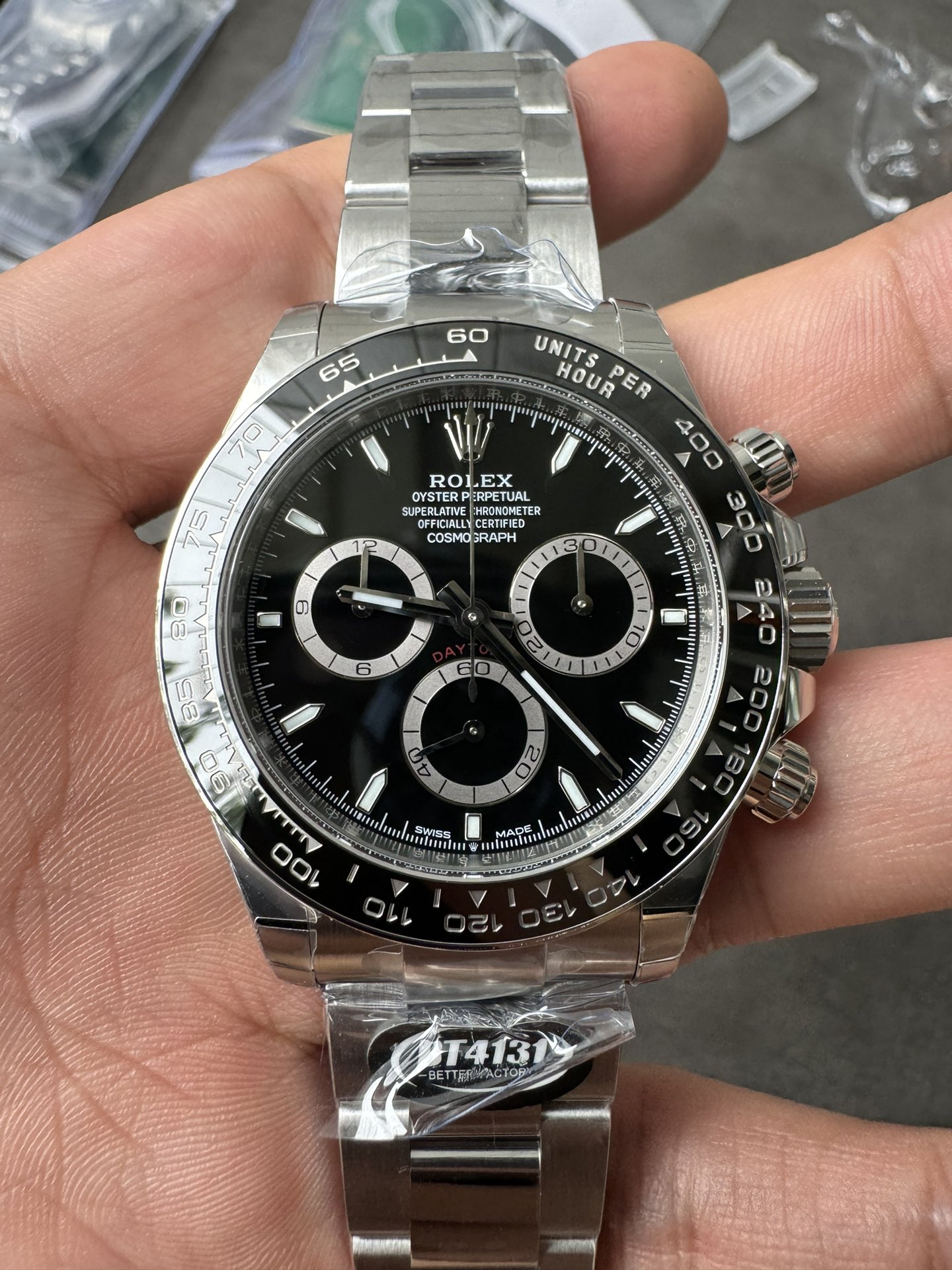 BT(ベター)ファクトリーによる最新世代のロレックス デイトナ 126500LN ブラック(Cal.4131)。丹東製Cal.4131ムーブメントを搭載し、全方位でアップデートを遂げた完成度の高いモデルです。文字盤・セラミックベゼル・ムーブメントのすべてを再設計し、厚さ11.8mmという原装同等のプロポーションを実現。特にCal.4131は構造強化と精密な仕上げにより、従来の複合機芯を凌ぐ安定性を発揮します。高精度かつ実用性を兼ね備えた、BTファクトリーの最新傑作です。