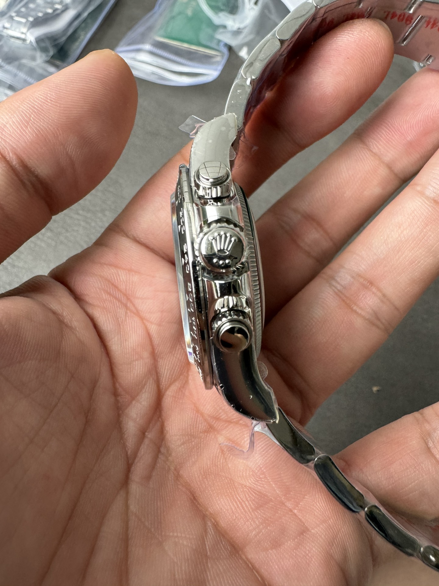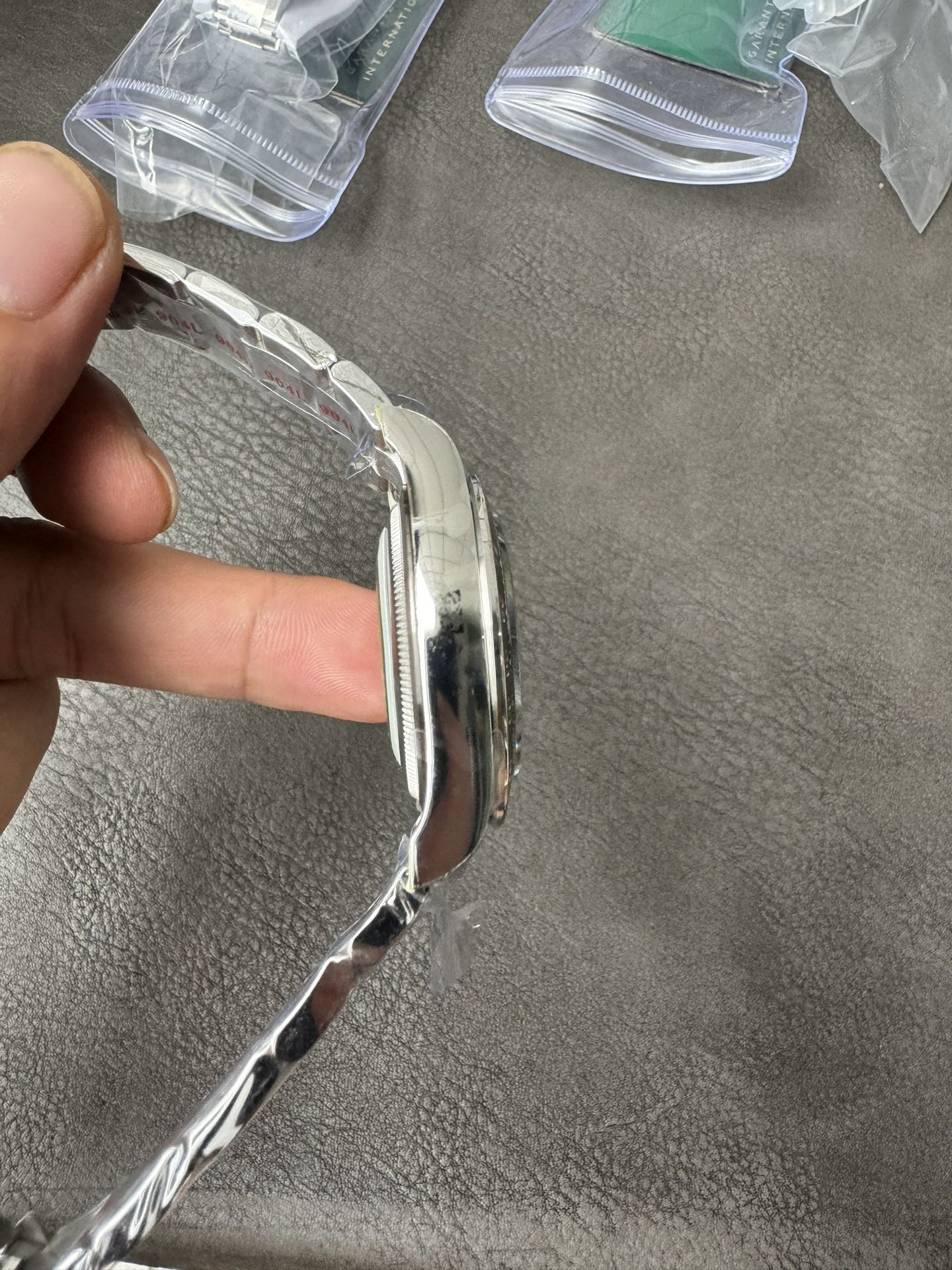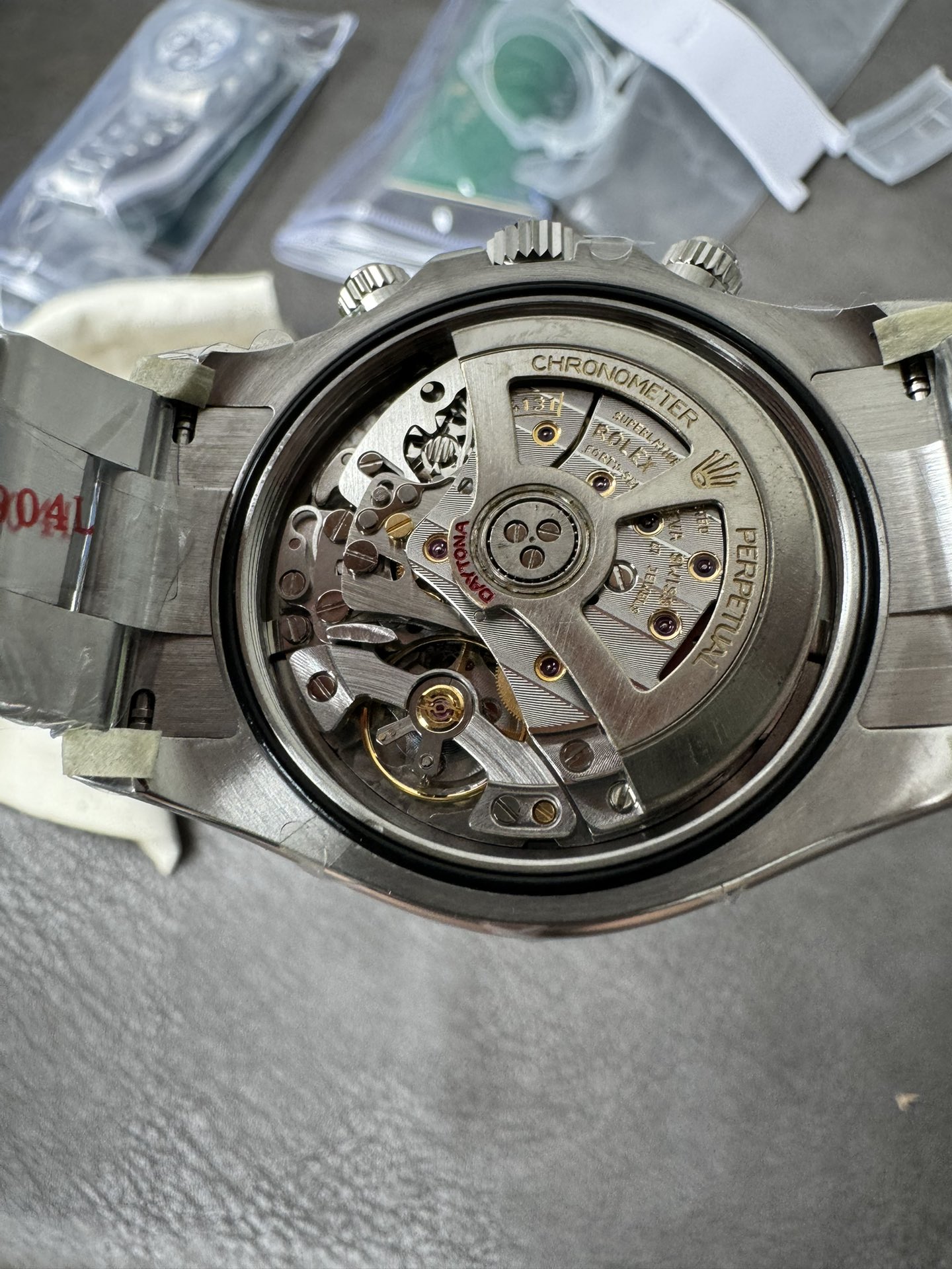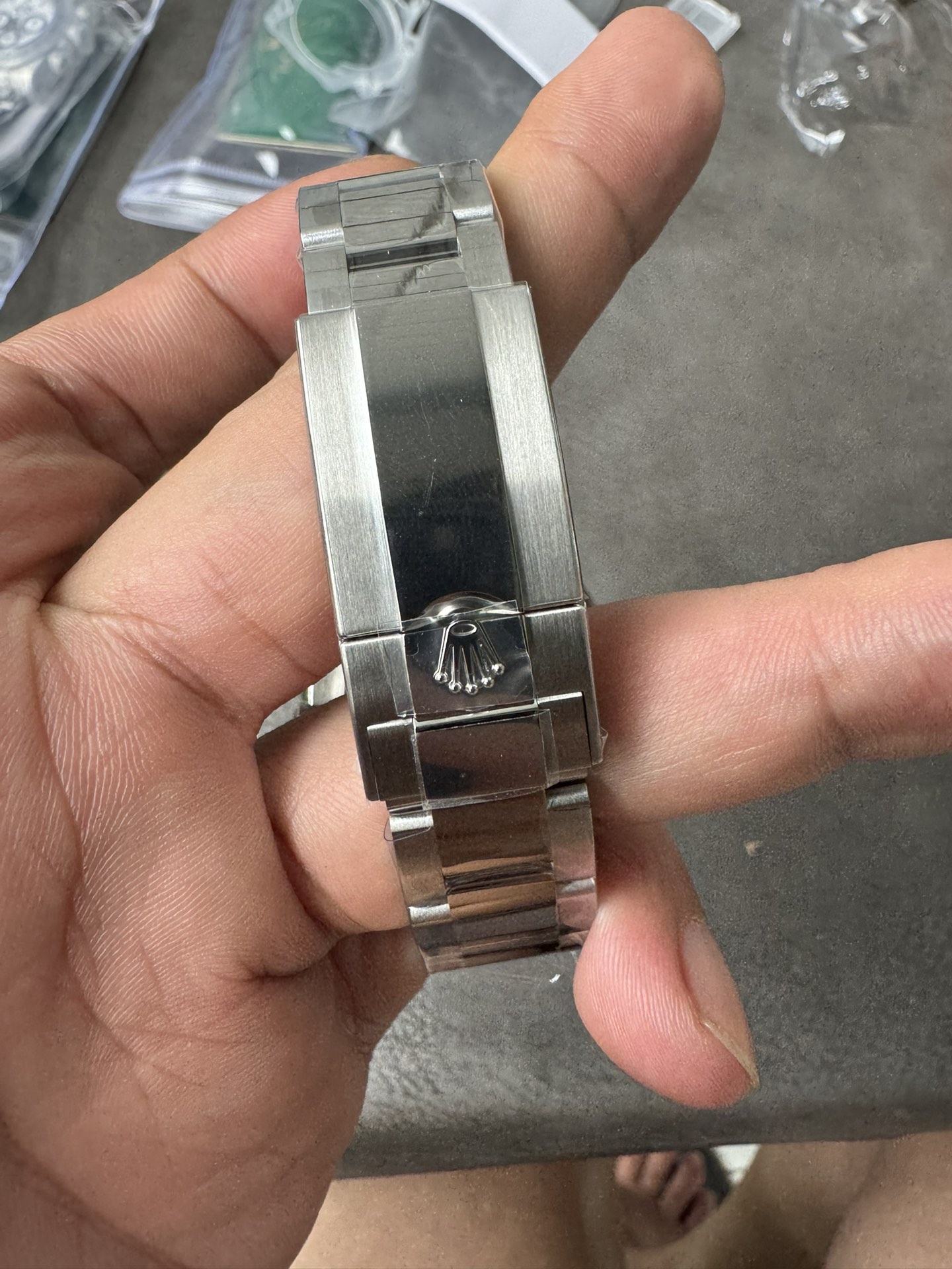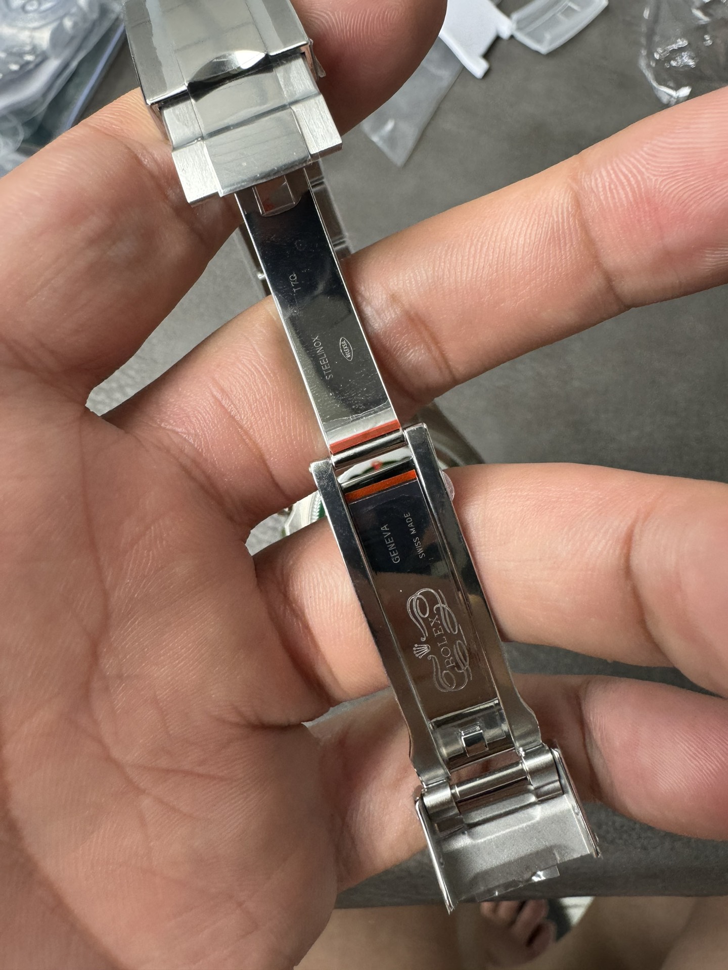 - ブレスレット:ARファクトリー製904Lスチールブレス。リンクのつなぎ目が滑らかで手首への馴染みも良好。