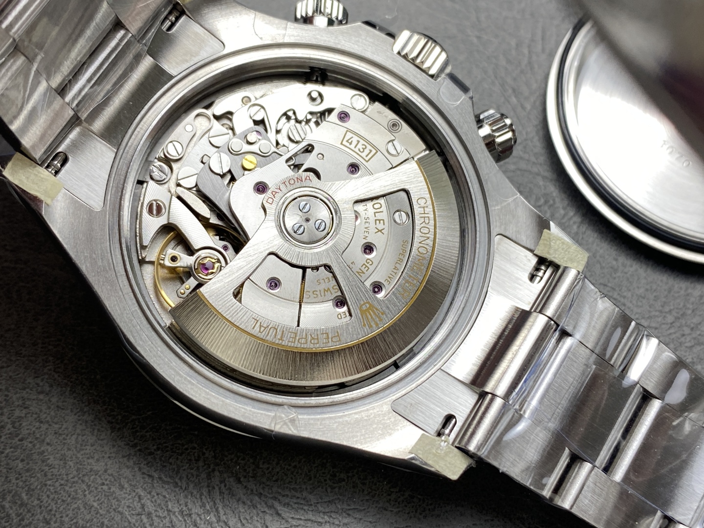 新世代デイトナの特徴である40mmケース、繊細になったインデックス、そして4131ムーブメントのレイアウトを正確に再現した、EWE工場の最新作。