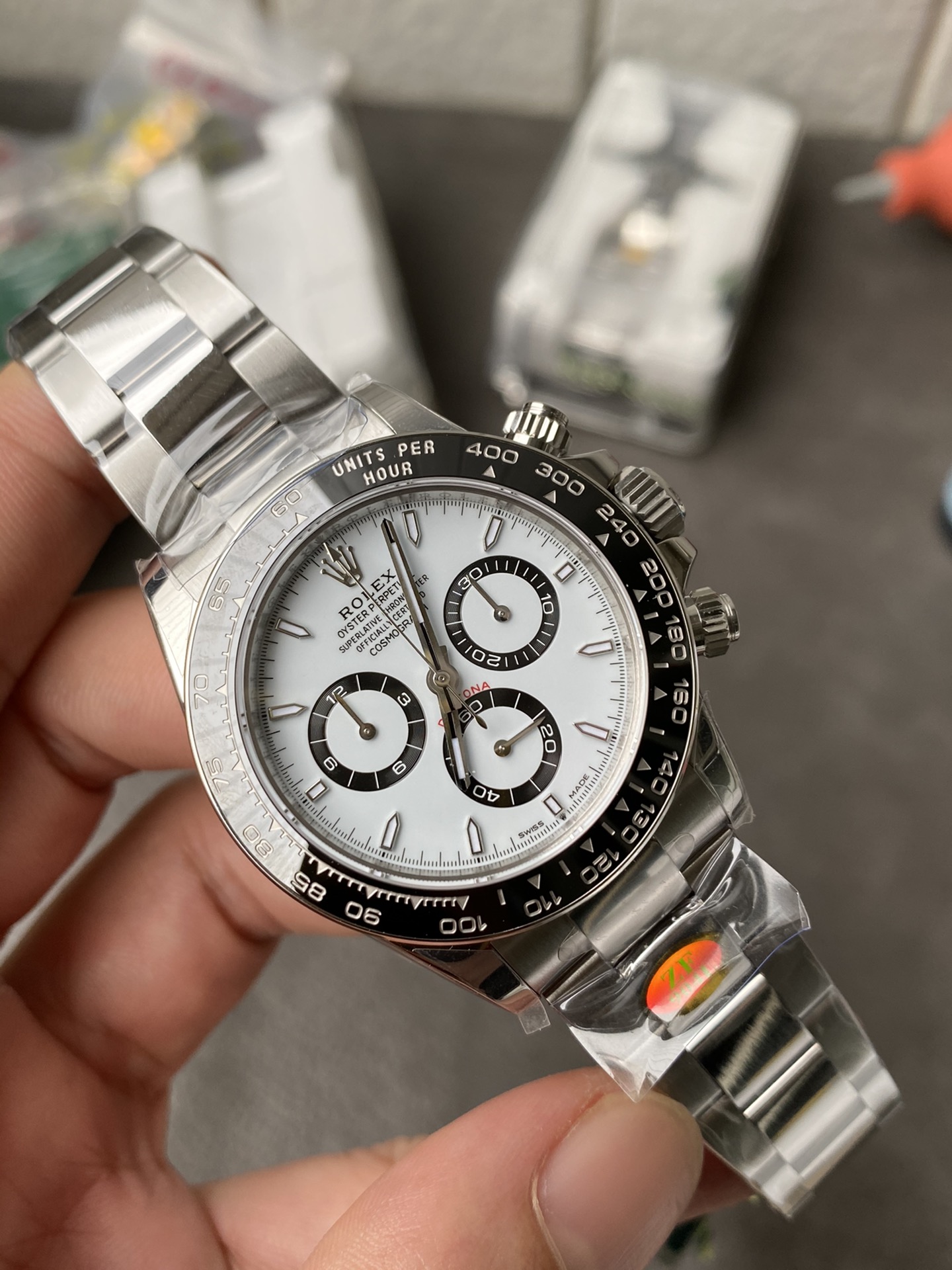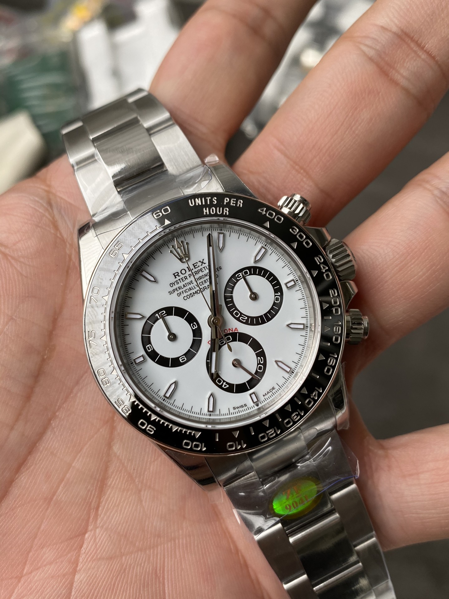 ZFファクトリーが誇る最新作、ロレックス デイトナ 126500LN ホワイトダイヤルが登場。真品を完全分解・再設計し、904Lステンレス製オイスターケースを採用。新開発のCal.4130一体型クロノグラフムーブメントを搭載し、72時間以上のパワーリザーブと滑らかな操作感を両立。ブラックセラミックベゼルにはPVD技術によるプラチナコーティング刻印を施し、質感・光沢・色調すべてが原装とほぼ同一レベルに到達した最新バージョンです。