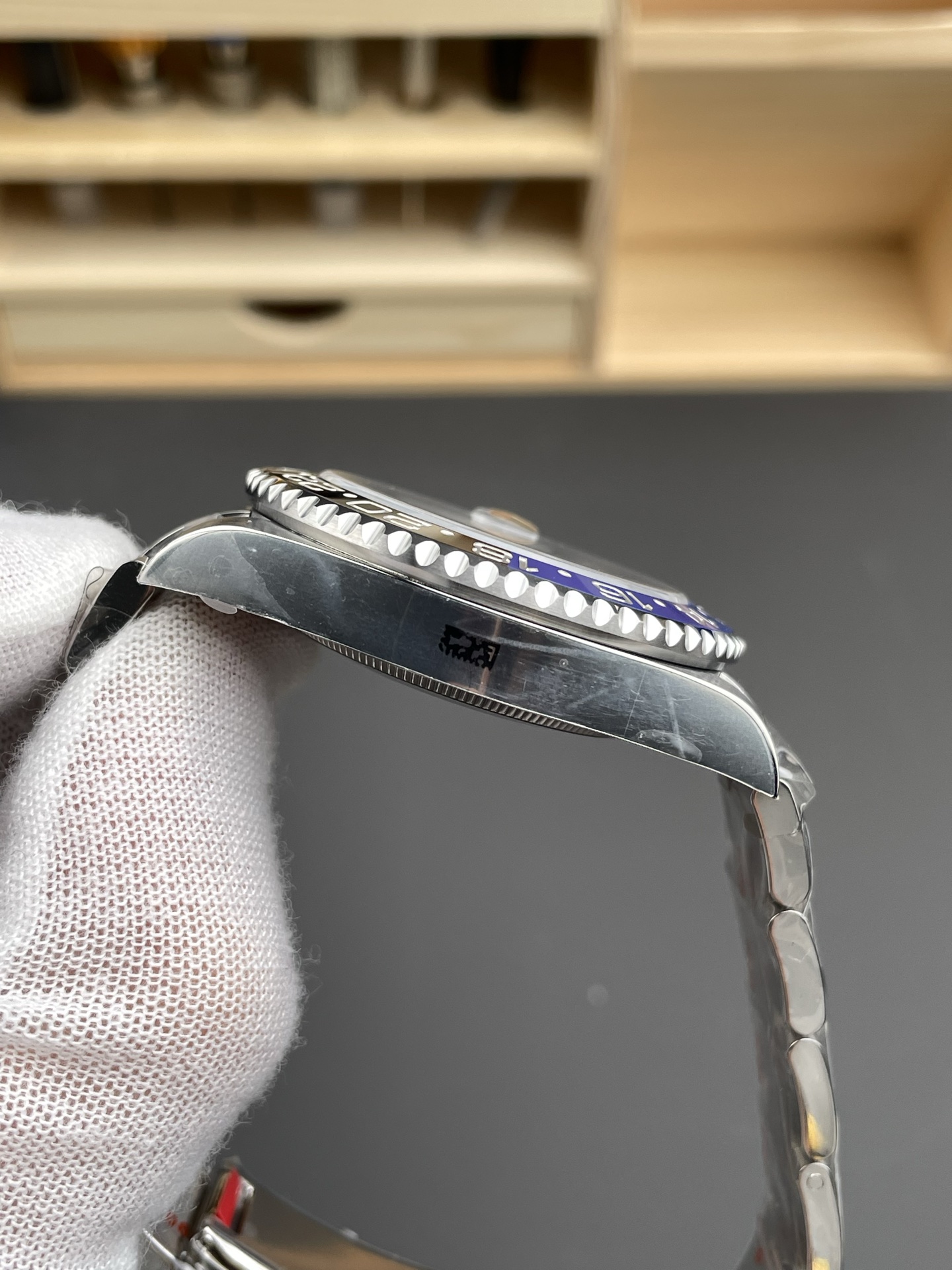 • ベゼル:青×黒一体成形の真セラミック 自然な“沁み色”の境界、レーザー彫刻・金属充填の立体文字、正規品同様の反射と深みを再現