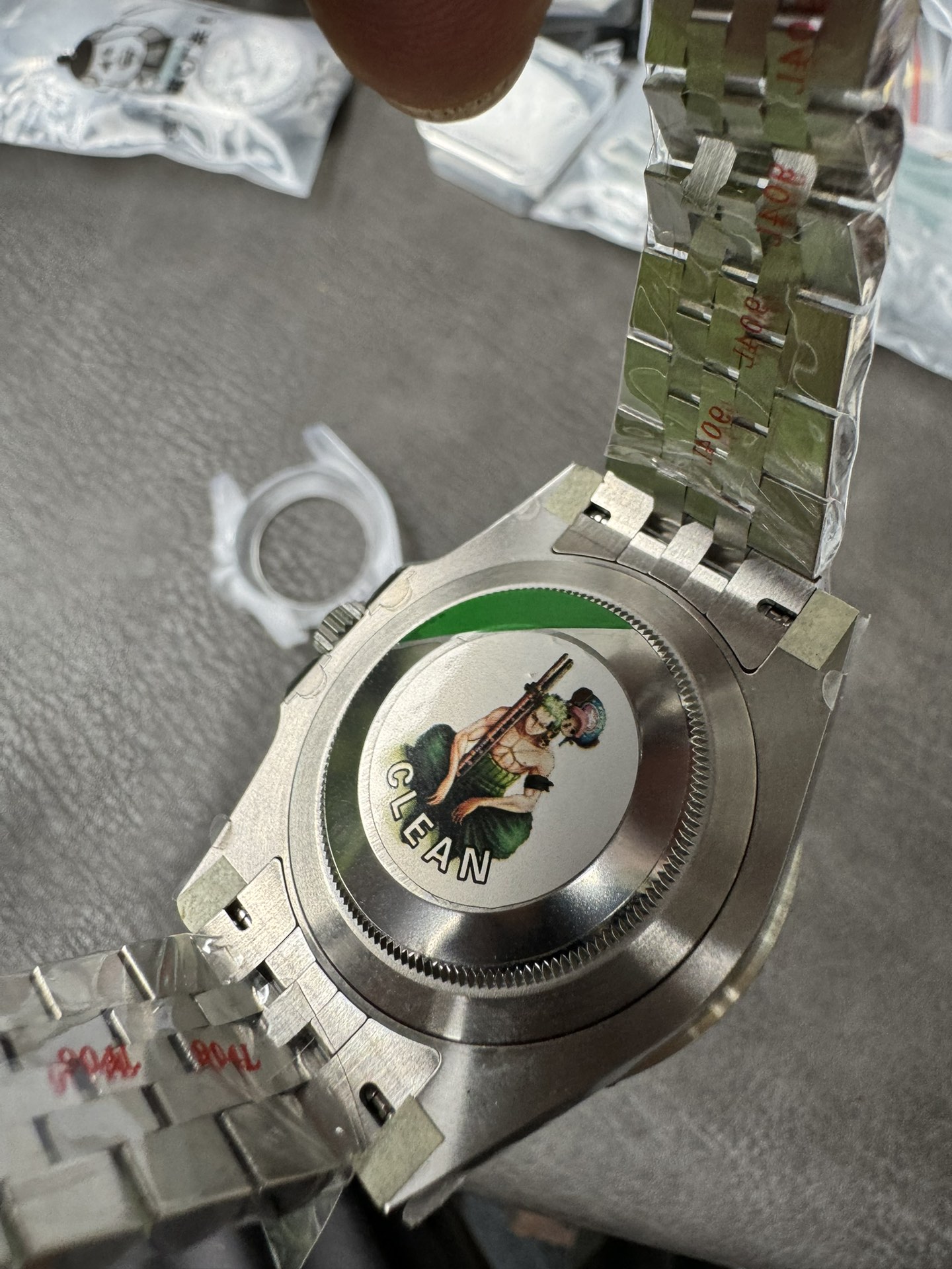 赤青セラミックベゼルは一体成形による発色で、両色の境界に自然な“沁み”のニュアンスが生まれ、正規品特有の濃淡まで再現しています。904Lスチールケースに組み合わされた AR製ジュビリーブレスは、表面のラグから駒のエッジ、折り畳みクラスプの5つ爪ロゴまで精密に仕上げられており、全体に統一感ある高級質感が感じられる一本です。