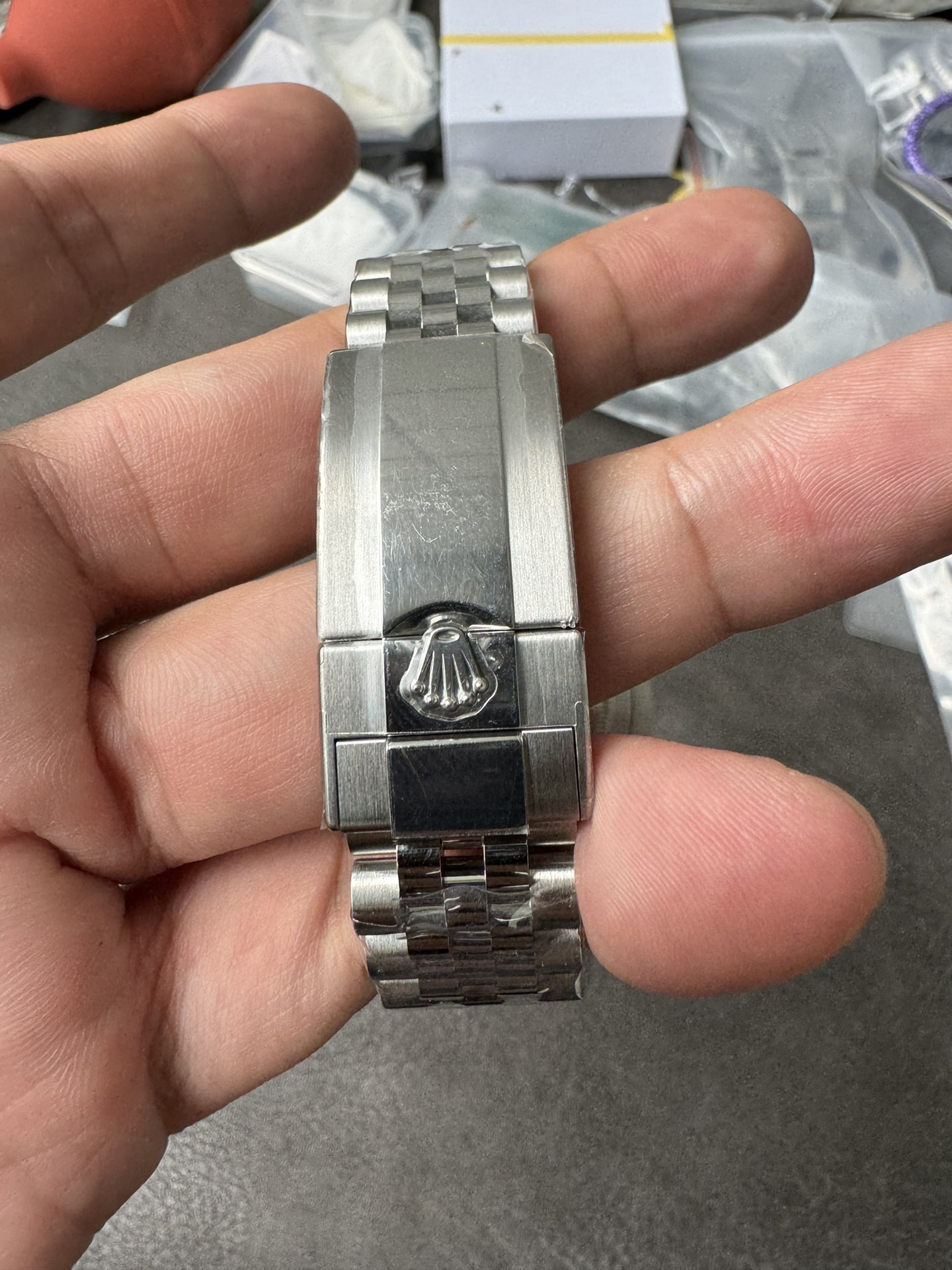 - ブレスレット:904Lジュビリーブレス(AR製)。駒のエッジとつなぎ部分の処理が精密で柔らかい装着感。